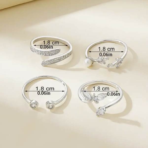 Šį rinkinį sudaro keturi atviri žiedai, puošti drugelio formos cirkonų dekoru, skirti mergaitėms ir moterims, kurios vertina eleganciją ir paprastumą. 🦋💍
