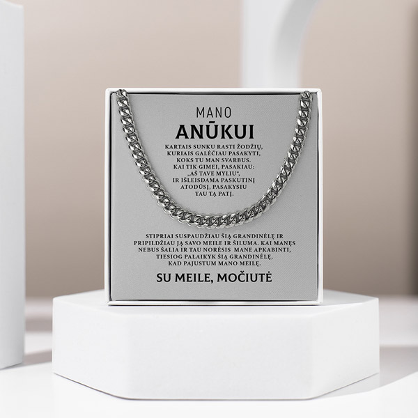 STIPRIAI SUSPAUDŽIAU ŠIĄ GRANDINĖLĘ IR PRIPILDŽIAU JĄ SAVO MEILE IR ŠILUMA. KAI MANĘS NEBUS ŠALIA IR TAU NORĖSIS MANE APKABINTI, TIESIOG PALAIKYK ŠIĄ GRANDINĖLĘ, KAD PAJUSTUM MANO MEILĘ.