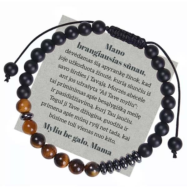 dėvėdamas šią apyrankę žinok, kad joje užkoduota žinutė, kurią siunčiu iš savo širdies į Tavąją. Morzės abėcėle ant jos užrašyta „Aš Tave myliu“: tai priminimas apie besąlygišką meilę ir pasididžiavimą, kurį Tau jaučiu. Tegul ji Tave džiugina, guodžia ir primena apie mūsų ryšį net tada, kai būsime toli vienas nuo kito.